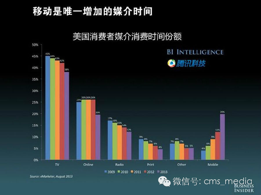 不过,移动媒体的消费时间是唯一增长的媒介形态,已经从2012年的12%增长到了20%。电视、广播、印刷媒体都在下滑。