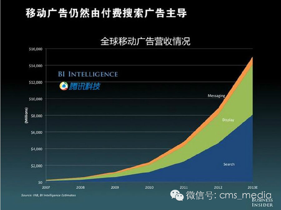 在移动广告市场中,付费搜索广告仍占主导地位。然后是展示广告、信息广告。在搜索广告中,谷歌毫无疑问基本占有了所有市场。