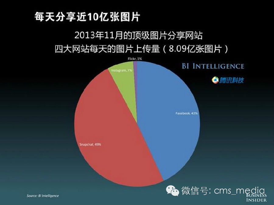 用户每天发布在网上的照片数接近10亿,分享量最大的四个产品分别是Snapchat(49%)、Facebook(43%)、Instagram(7%)、Flickr(1%)。