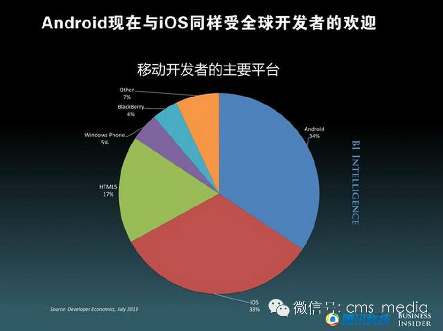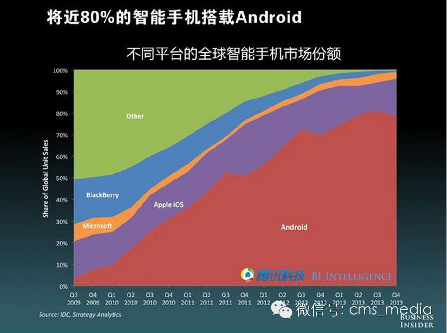 Android已赢得移动平台之战,全球约80%的智能手机都搭载Android系统,60%的平板电脑是Android系统。Android吸引的开发者比例超过了iOS,而且系统碎片化问题大有改善。