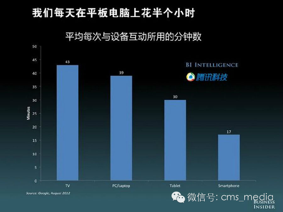 在和不同设备的每次互动时长方面,电视和PC依然更高。用户一旦开始看电视,平均会看43分钟。而和手机的单次平均交互时间只有17分钟,平板电脑可以达到30分钟。
