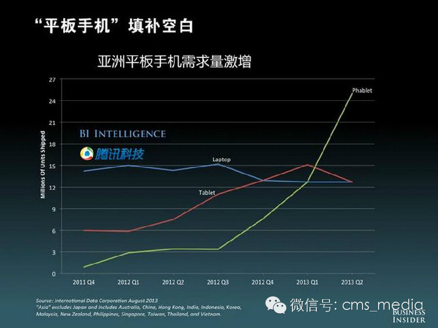 2013年全球智能手机的出货量达到了10亿,其中三星和苹果公司手机出货量分别位居一、二名。而在亚洲地区,用户对“平板手机”的需求量出现了激增。