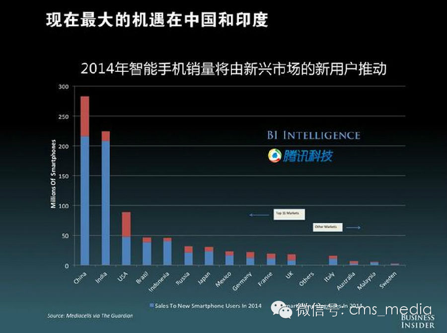 发达国家的智能手机市场虽然已经饱和,增长放缓。但在2014年,中国和印度市场将成为智能手机销售量最主要的拉动力量。
