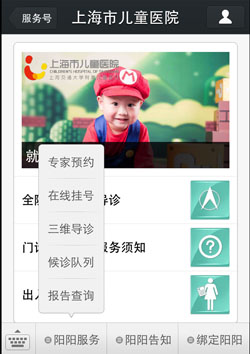 据悉,只要家长关注“上海市儿童医院”微信,就可以在任何地方、通过微信完成“在线挂号、预约服务、报告查询、候诊排序”等服务,大幅度缩短候诊时间,实现出门前挂好号,算好时间到医院,来院后在收费窗口进行确费后即可就诊。