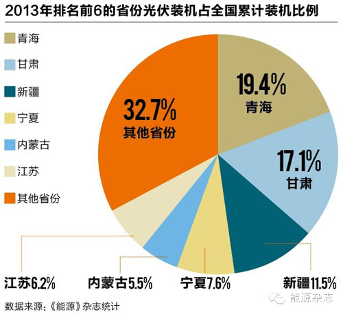 2013年排名前6的省份光伏装机占全国累计装机比例