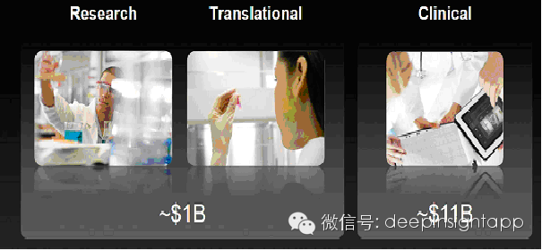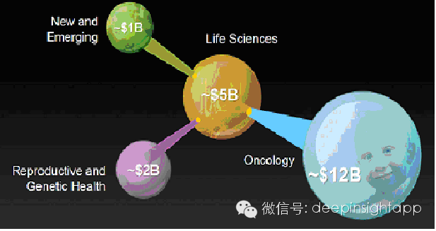 我们再来看看市场空间最大,有120亿的肿瘤市场。其中110亿的空间将来自于临床诊断。包括基因顺序,分子观察,治疗诊断剂,以及研发控制肿瘤的新药。