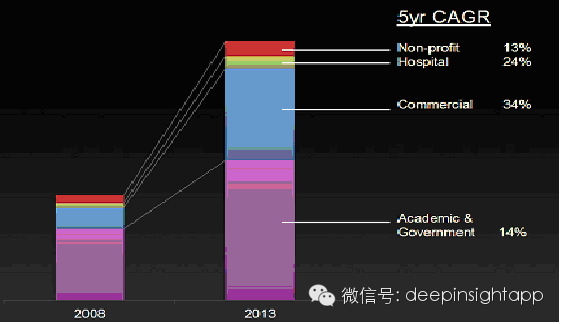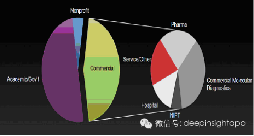 那么过去五年增长最快的商业化用途又是如何具体分布的呢?我们看到大头是商业的分子诊断,医药研发。无创产前检测技术(NIPT)和医院也占据了一部分。
