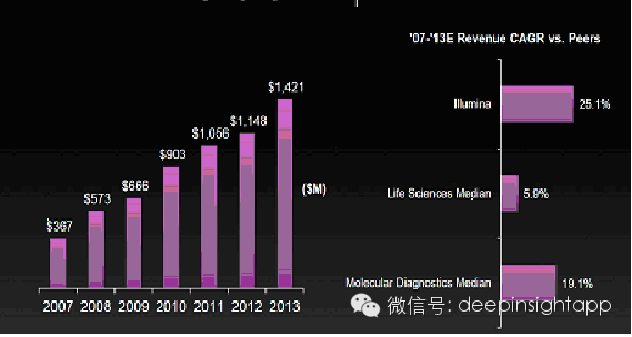 首先这是Illumina的收入增长。2013年同比增长24%达到了14亿美元。2007年以来收入增长了几乎四倍,从3.6亿增长到14亿。而07-13年的复合增长率25%,大幅超过分子诊断的19%和生命科学的5.9%增长中位数。