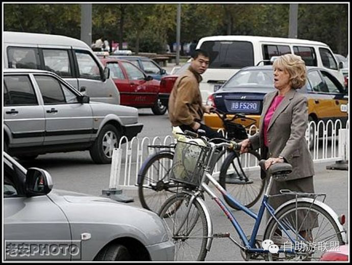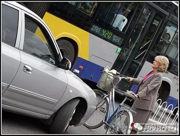 老外下了自行车,微笑着劝说司机回到机动车道去。