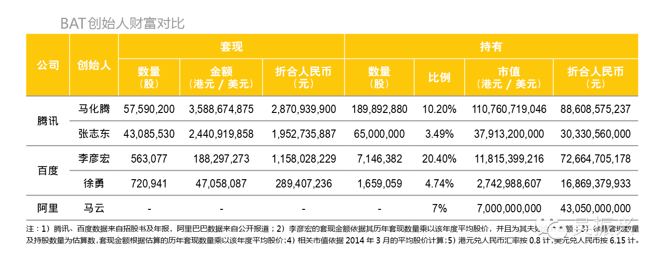 对于已经上市的腾讯、百度,其创始人皆进行了不同程度的套现,要精准计算其财富并非易事,而且有些联合创始人的持股数量并未完全披露,因而我们只能选择其中部分创始人进行相对精确的计算。而至今未上市的阿里集团,由于公开资料有限,马云是否进行过套现不详(已退市的阿里巴巴网络有限公司(01688.HK)在香港上市期间,马云曾于2009年9月高位抛售1300万股,套现约2.7亿港元),其财富数额在某种程度上也是根据公开资料进行大致的估算。