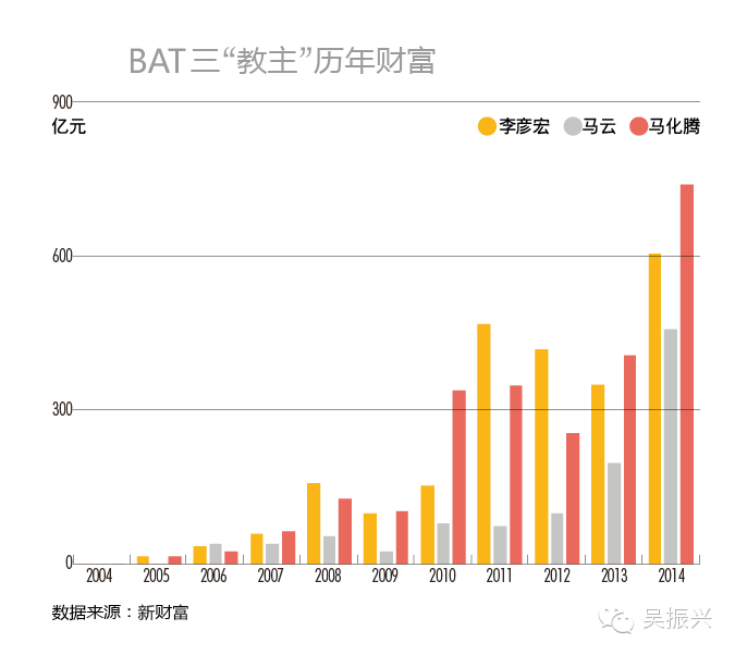 “三教主”于2004年首次进入“新财富500富人榜”,当年李彦宏的财富为10亿元(第156位),马云的财富为5.3亿元(第284位),马化腾的财富为3.5亿元(第398位)。及至2014年,三人财富分别达到608亿元、457亿元、739亿元(2013年12月31日市值数据),各自财富分别增长了60倍、86倍、210倍。