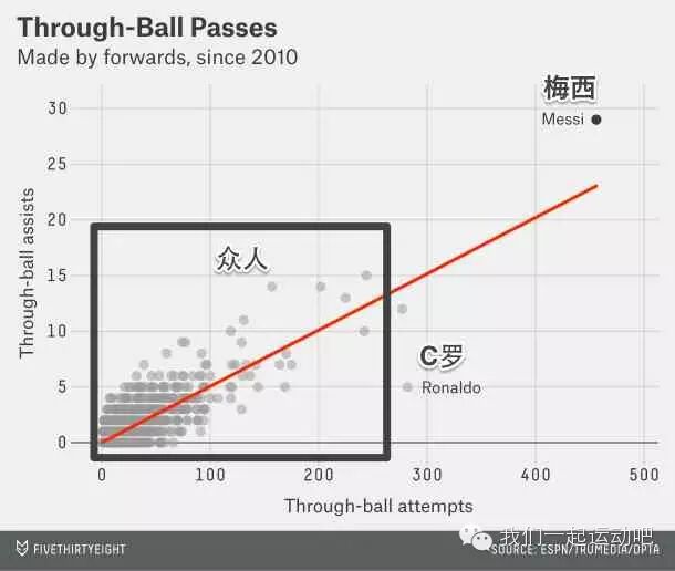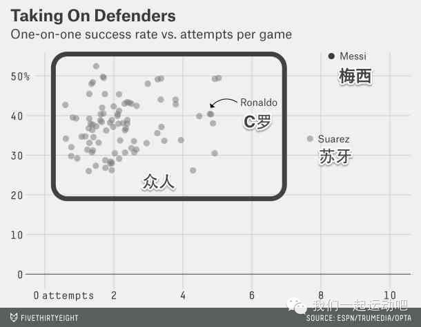 盘带素来是煤球王的强项。下图横轴为每场尝试过人次数,纵轴为过人成功率。统计显示梅西每场尝试过人次数显著高于包括C罗在内的其他球员,只有最近被逐出世界杯的苏牙能稍微接近。可惜相比过人成功率超过50%的梅西,苏牙的成功率还不到40%,就有些志大才疏啦。