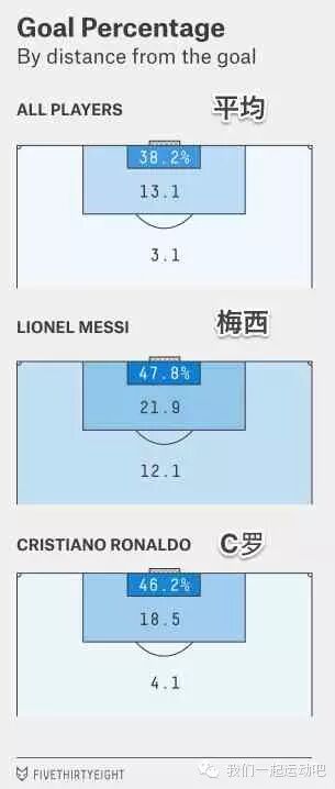 下图比较的是前锋的射门区域,通常越接近球门,前锋越有把握,进球几率也就越高。统计显示,普通前锋在小禁区射门的进球概率是38%,顶级前锋如梅西和C罗能提高10个百分点,成功率接近50%。在大禁区内,梅西的射门成功率高出平均水平9个百分点,高出C罗3个百分点。而在大禁区外,煤球王的进球率仍然达到了惊人的12%,达到最强对手C罗的3倍!因此,请相信梅西在对伊朗比赛最后一分钟打进的致胜球绝对不是蒙的,今天吸引瑞士整条防线也并非偶然,而是因为煤球王在禁区前沿极其恐怖的震摄力!