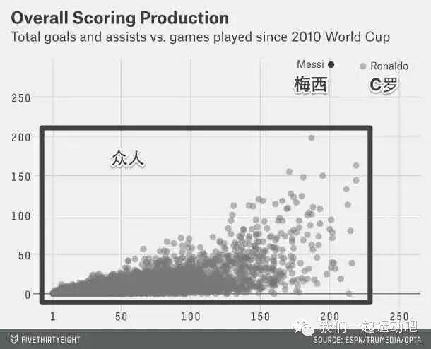 趁着这股梅西热,美国有线体育电视网ESPN下属的数据分析博客FiveThirtyEight运用时下流行的大数据分析,统计了含梅西在内共16574位球员自2010世界杯以来共24904场比赛的过人,传球,射门,进球数据,通过数据对比直观展现煤球王的卓尔不群。主页君在此摘译部分,与各位吧友分享。