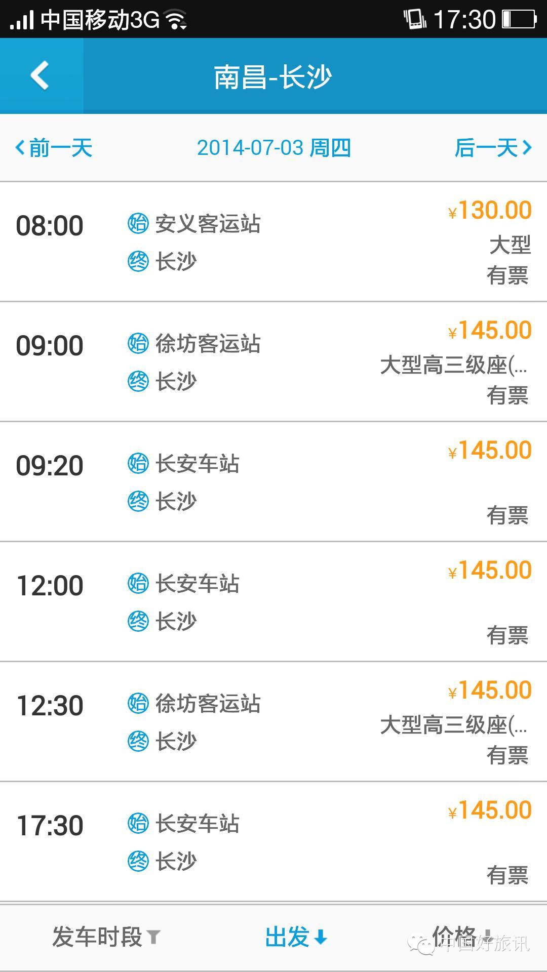 记者点选南昌到长沙的汽车票测试,发现已能丰富涵盖所有的南昌出发汽车站,并能依发车时段或价格等排序。