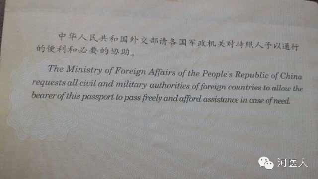 中国护照上写着:中华人民共和国外交部请各国军政机关对持护照人予以通行的便利和必要的协助。