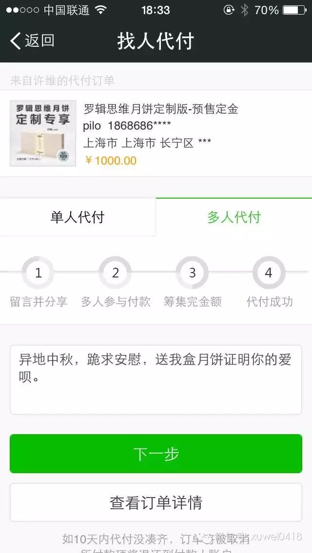 但是那一天我们发现199元确实成本有点高,还有一些人,他一下子下单十盒,人家一看说十盒,1990呀,还不如请他吃顿饭呢。于是我们很快花了三四天的做了一个新的功能,可能有的人管它叫众筹,我们叫多人代付,你下单以后,你可以让很多朋友一起来帮你付,一个人付一点。