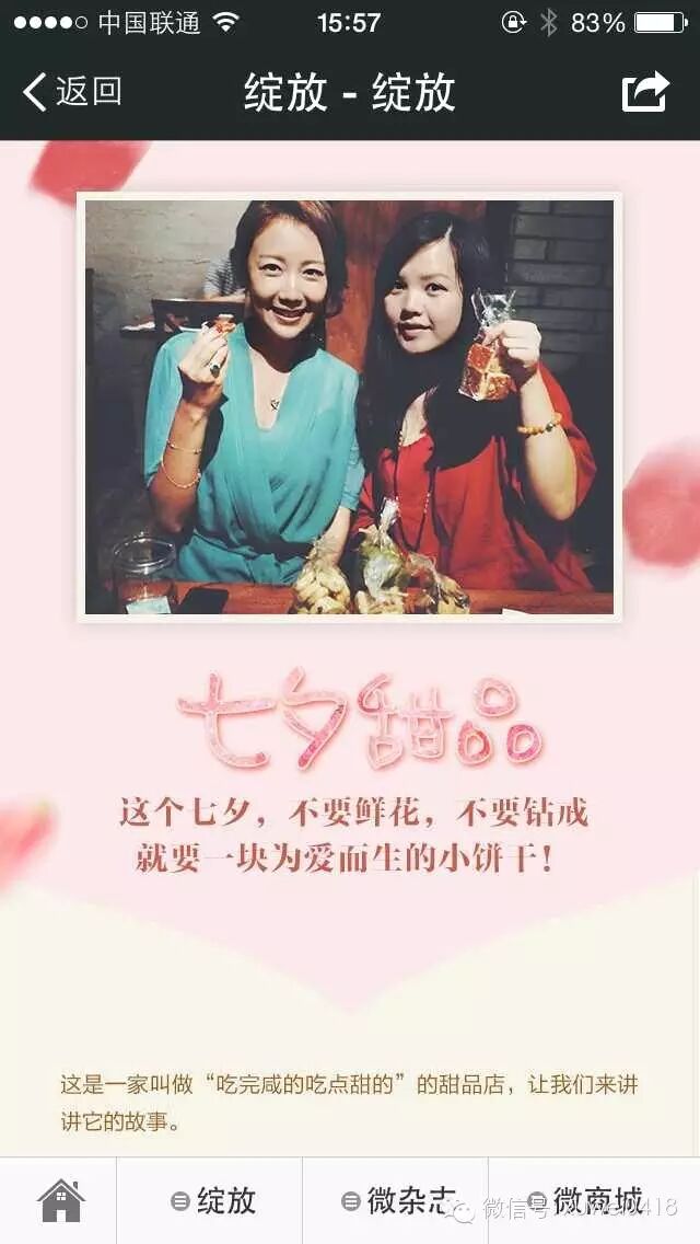 刚才我们说了第一个核心的东西,就是做上新通知和新款通知,第二个核心的东西是给会员的福利,给会员提供一些不同的福利和不同的服务。比如说前几天绽放有一个闺蜜赵小姐,她的老公当时追她的时候说,以后让她吃饭再也不用排队,于是给她开了一个饭馆叫“赵小姐不等位”。她喜欢吃甜品,于是老公又开了一家“吃完咸的吃点甜的”甜品店。在七夕那一天,你可以在绽放的店里买到赵小姐店里的甜品。