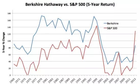 从2008年到2013年的5年中是一个例外,标普500回报率为128%,而伯克希尔每股净资产收益率为80%。