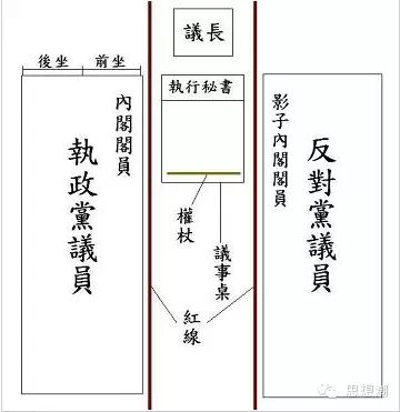 议长右侧的长椅上,第一排坐的就是首相和他的内阁成员,后面是支持他们的执政党议员们。对面第一排,坐着主要的反对党成员,如“影子首相”、“影子内阁”,后面就是反对党的议员们。完全是两军对垒的阵势。在第一排椅子前面,地毯上各有一条鲜明的红线,任何人不可越过。谁要是说着说着激动起来过了线,就会遭到议长的训斥。两条红线间的距离,是两边的人都拔出剑来的话,还刚好够不着,可见英国议会历史的久远,当年议员们一激动,弄不好会打起来的。