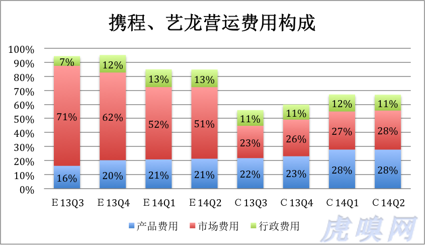 可以看到:在品牌宣传方面,携程的规模优势明显。假如携程、艺龙、去哪儿各自在分众投放1000万广告,宣传效果大同小异,但占各自营收的比值则大不相同。2014年二季度,携程市场费用为4.8亿,艺龙为1.5亿,不及携程的三分之一。艺龙市场费用在大幅降低后,占营收的比例仍然高达51%,携程最高不过28%。(去哪儿尚未公布二季度财报,今年一季度市场费用占营收的39%)