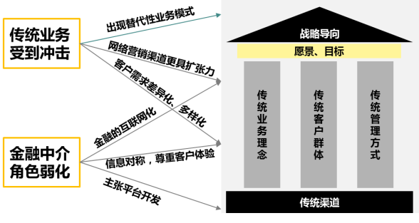 安永分析,传统金融进入移动互联时代将面临业务的颠覆式变革。移动互联网所带来的资金、信息、交易渠道的变化,使商业银行面临前所未有的挑战,传统商业银行面临角色被弱化的风险,将严重影响业务发展。
