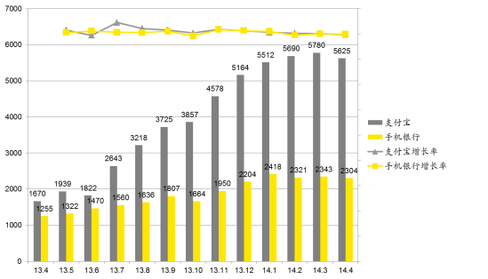 根据iresearch数据显示,截止2014年4月,支付宝App月度日均覆盖人数高达5625万人,而所有银行手机银行App月度日均用户覆盖人数之和仅有2304万人。移动端第三方支付已经超越手机银行成为最主要的支付渠道。