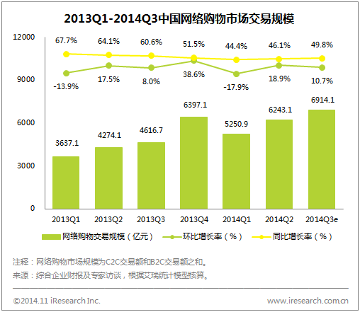 艾瑞咨询最新数据显示,2014Q3中国网络购物市场交易规模达6914.1亿元,同比增长49.8%;根据国家统计局发布的数据显示,2014Q3我国社会消费品零售总额达到6.5万亿元,网络购物在社会消费品零售总额中的占比为10.6%,单季度渗透率继续攀升。