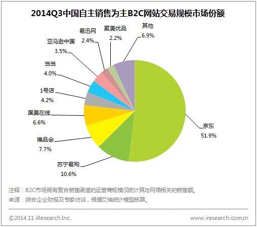 从2014Q3来看,B2C市场中,天猫依然保持近六成的市场份额占比,京东占比达到19.3%,其余B2C企业中苏宁易购、国美在线、1号店、聚美优品的环比增速均高于B2C行业整体增速,唯品会、1号店和国美在线同比增速均高于B2C行业整体增速。从自主销售为主B2C市场来看,京东占比超过五成,苏宁易购占比达到10.6%,唯品会及国美在线占比均超过5%,市场集中度依然较高。
