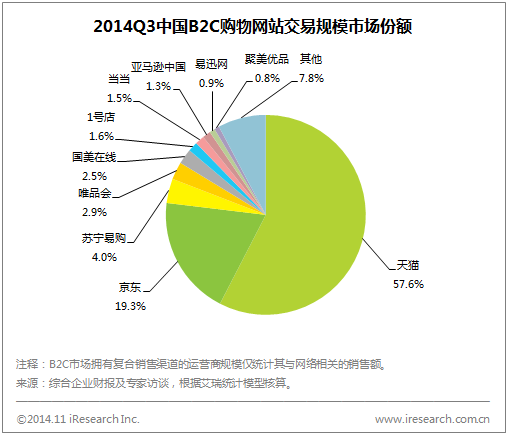 根据艾瑞咨询最新数据显示,2014Q3中国网络购物市场交易规模为6914.1亿元,较去年同期增长49.8%;从网络购物市场结构来看,B2C占比达到44.2%,与去年同期相比提高5.4个百分点;从网络购物市场份额来看,B2C市场中天猫占比近六成,继续领跑B2C市场,京东发展迅速,在自营B2C市场中占比过半。