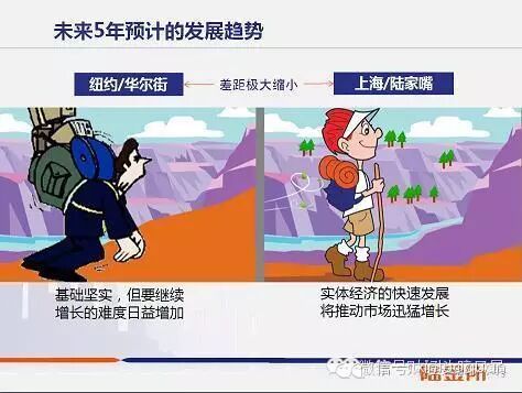 我们先看纽约华尔街。人的年龄绝对超过50岁。比我大一点,这个人带的负担蛮多。2008年危机之后,政策不支持,创新发展有限,成长变慢。他是有经验,是稳定,但是他未来的路会越来越难走,再看上海陆家嘴,人比较年轻,比较有动力,比较有活力,比较有想法,比较有创新的意识,而且他的市场和政策都是支持他的,他未来的路会越来越宽。
