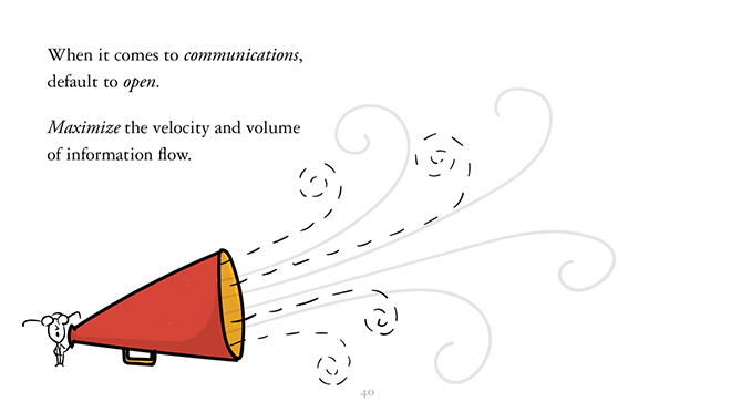 尽量让交流保持开放。让信息流动得更快一些,信息的声量更大一些,让更多人能参与进去。