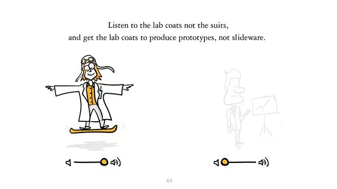 听那些在一线实践的人的话,不要听那些空谈。让他们做产品的原型,而不是空泛的 PPT。