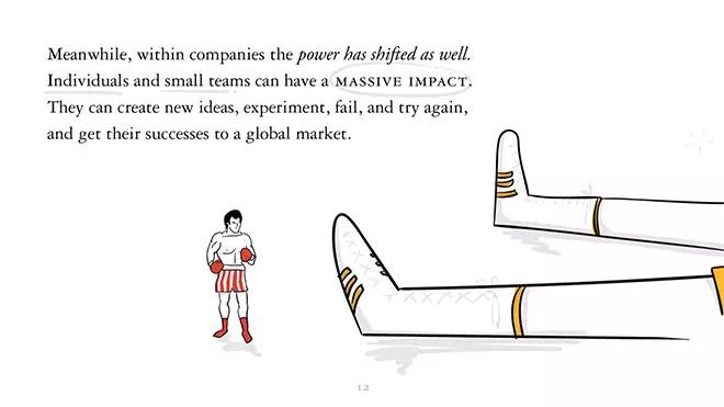 同时,企业的力量也发生了巨变。个体或小团队可以拥有巨大的影响力。他们可以创造出崭新的想法,再历经测试、失败,再重新开始,最后成功获得全球市场。