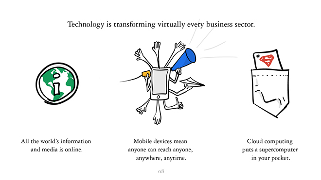 科技正在改变商业的方方面面。全世界的信息和媒体都是在线的。移动设备让人们可以随时随地联系任何人。云计算将一个超级计算机收入你的口袋中。