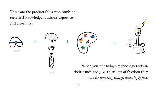 他们是结合了知识、商业专长和创造力的产品人。如果你把当今的科技工具放到他们手中,并给予他们发挥的自由,他们可以以一种出奇的速度,创造出奇的产品。