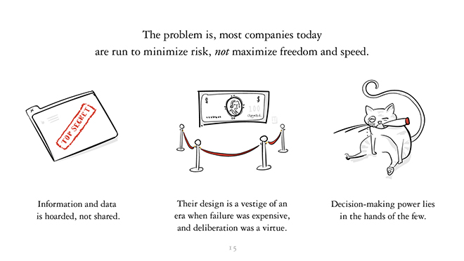 问题是,今天的大多数企业,他们的目的是让风险最小化,而不是让自由和速度最大化。信息和数据被严格保密,却没有用作共享。在过去的年代,犯错成本高昂,人们赞赏三思而后行,而他们的设计就是那个年代遗留的产物。决策权被掌握在少数人手中。