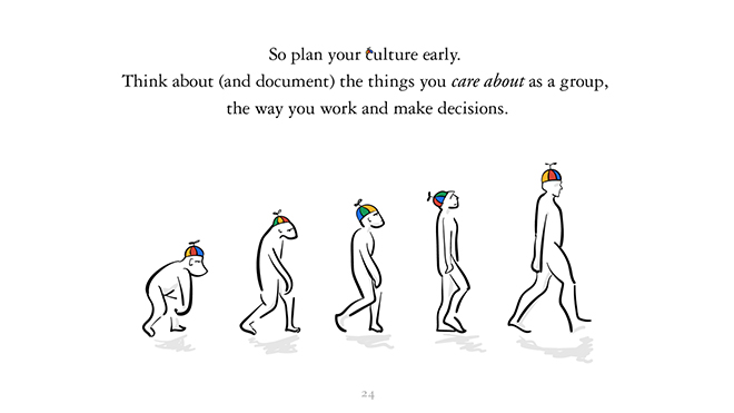所以,尽早开始规划企业文化。作为团队你在乎什么,工作和决策的方式是怎样的,这些都要考虑并梳理成文档。