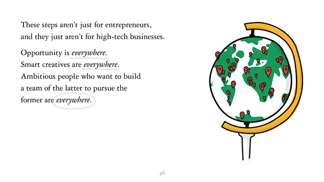 以上步骤并不仅适用于企业家,也不仅对高科技事业有效。机会到处都是,创意人员到处都是。心怀抱负,想要建立创意团队来争取机会的人也到处都是。