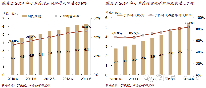 用户向移动端迁徙是未来趋势。2013年,我国互联网用户6.3亿,渗透率46%,其中移动互联网用户达5亿,未来移动端用户加速增长趋势明显。