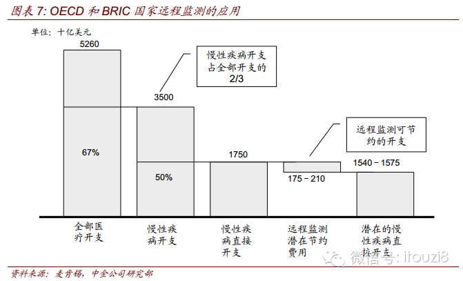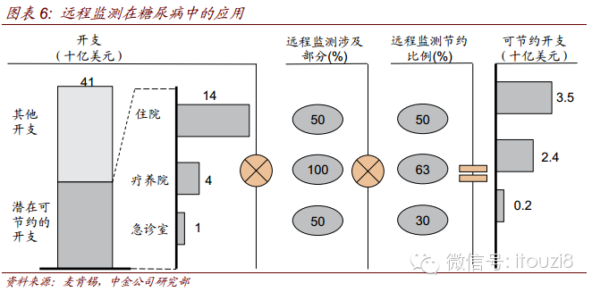 举例来说,远程监测能有效节约诊疗费用。麦肯锡研究报告表明,远程监测能显著降低患者前往医院、急诊室看病的频率以及入住疗养院的比例,更多患者在家就能实现监控、诊断、治疗、保健的目的,这是远程医疗节省卫生费用的主要来源。经测算,以糖尿病为例,在美国,每年远程监测可以节约15%的开支。