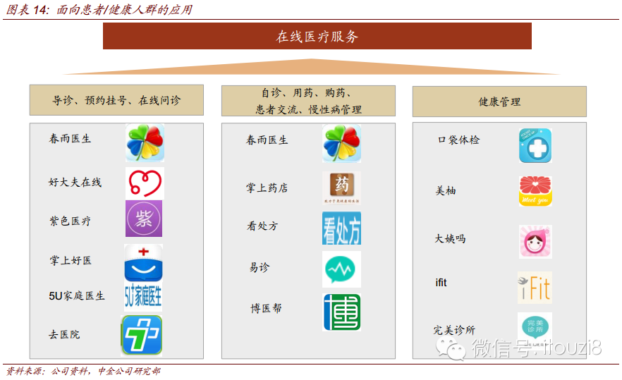 我们在本篇报告中主要讨论纯手机应用和网页版应用(无设备进行前端数据采集),并将此定义为在线医疗服务。软硬件结合形式的可穿戴设备模式(即有设备进行前端数据采集),我们将在可穿戴医疗行业报告中单独阐述。