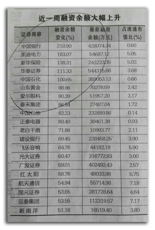 同样列在最近一周融资余额(12月10日之前的一周)大幅上升的前20只股票中的中国银行、新华保险、中国石化、中国石油、建设银行、光大证券、广发证券等同期热门个股中,最新融资余额占对应股票的流通市值的比例,分别为0.60%、5.02%、0.66%、0.14%、3.90%、3.00%、2.57%。由此可以发现,拉升上述个股,尤其是类似中国银行、建设银行、“两桶油”等航母级个股的主要资金来源,却并非融资而来的;非融资资金拉升,则意味着是场内存量资金和场外增量资金拉升了那些航母级个股——由此我们可以不难得出这样的结论:有巨量场外资金,已经在近期迅猛地进入了股市,而且这些资金的量级,是远大于8000亿元的融资资金总额的。这一结论非常重要,它说明,场内外资金对A股市场的信心得到空前的提高,这波牛市具备极为广泛的流动性基础,大可看高一线。也说明,6000亿到8000亿的日交易量,将成为未来市场的新常态,直接受益的券商股的上涨空间无可限!