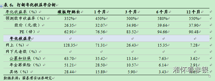 我们根据目前新股的市场表现,假设持有公司不同时间所获得不同的涨幅,不考虑持有期间资金的机会成本,仅考虑打新冻结2-3天的机会成本,我们认为从年化收益率的角度,破板时卖出的收益是最大的。如果仅考虑股票涨幅,最近很多新股持有1个月涨幅大于破板时,加之我们预计2014年仅仅是股票牛市的开端,我们预计国信证券持有6个月的股票涨幅可能会大于破板时。