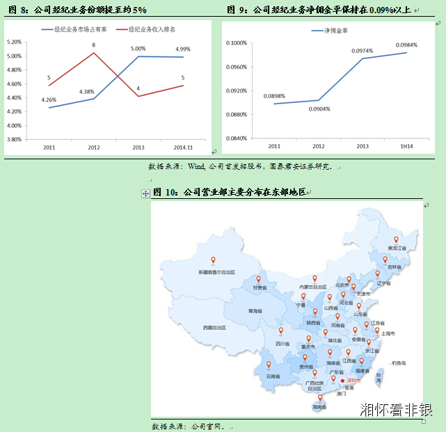 公司市场占有率一直处于行业前列,交易佣金率总体高于行业平均水平。我们认为2015年公司佣金率可以保持稳定,原因有三:1.预计2015年市场交易持续活跃,牛市行情下券商对佣金的议价能力提升;2.公司通过IPO补充资本金,两融业务爆发潜力大,相关业务佣金率更高;3.公司主要线下营业网点地处广深等竞争程度较充分的地区,后续发生佣金的恶性竞争的可能性较小。