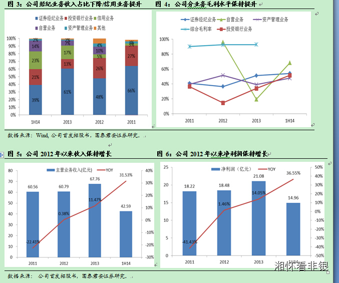 依靠市场化的项目分成体制和薪酬结构,公司在股票和债券的保荐与承销业务方面有较强竞争优势。2007年至2012年连续六年被深交所评为“最佳保荐机构”,在中小企业板、创业板市场保荐上市的承销家数和金额均位于行业前列,2012年和2013年公司连续两年债券主承销家数位列行业前列。报告期内各年,公司投资银行业务收入占营业收入的比例分别为28.05%、27.41%和12.51%。我们预计注册制改革有望在2015年下半年后取得突破,公司承销项目集中在中小板和创业板项目上,将受益于注册制改革。