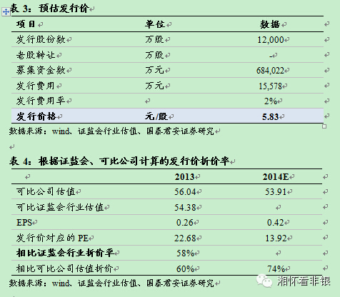 根据国信证券的发行股份数与募集资金总额分析,我们预估发行价5.83元,相比证监会参考的可比行业估值折价58%,给投资者预留了充足的空间。
