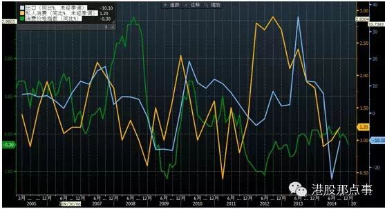 上图绿色线为瑞士CPI同比,黄色线为消费同比,蓝色线为出口同比