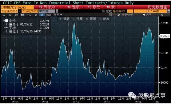 市场极度看空欧元,空头水平达到历史高点,在市场越来越预期欧洲QE的时候,实际上瑞士央行成了全球的对手方,仍然在按照固定汇率去购买欧元,成了“肥羊”,因为欧元怎么跌,瑞士央行都要被迫接手。下图是CFTC投机性做空欧元仓位,已经较高。瑞士央行可能预期到马上欧洲要开始QE,可能成本过高,难以再维持该汇率。