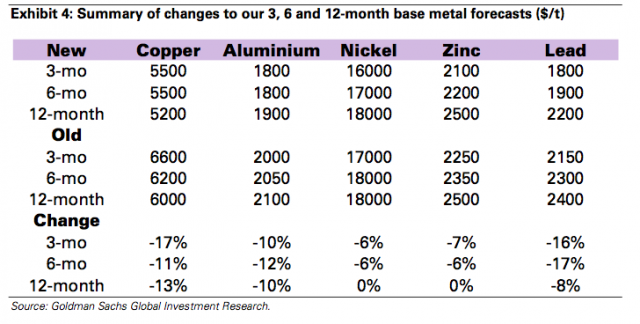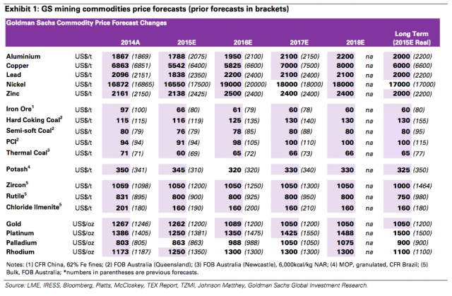 高盛调低对矿业大宗商品价格的整体预期,原因一方面是目前正在发生以及预期还会持续的成本通缩(cost deflation)现象,另一方面是需求增长的疲软。下图中的资产价格预期全面下调(括号中是原预期值):
